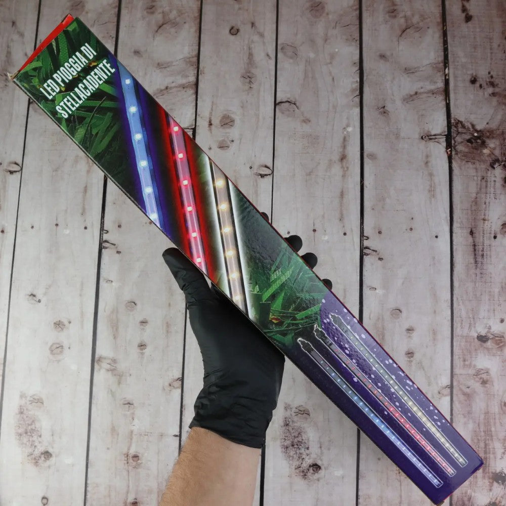 Гірлянда Метеоритний дощ своїм сяйвом, що біжить зверху вниз, створює приголомшливий світловий ефект, який стане оригінальною прикрасою в новорічному декорі приміщень, дахів, карнизів, арок, дерев, стін і новорічних ялинок! Гірлянда представляє прозорий кабель ПВХ, що несе, довжиною 2,8 метра, від якого вниз опускаються 8 пластикових трубок довжиною 48 см з розташованими всередині SMD світлодіодами. Спеціальний вбудований мікрочіп створює світлодинамічний ефект «падаючої краплі» шляхом послідовного включення світлодіодів зверху донизу. Під час світіння, коли по черзі включаються діоди, створюється ефект краплі води, що стікає по бурульці.
