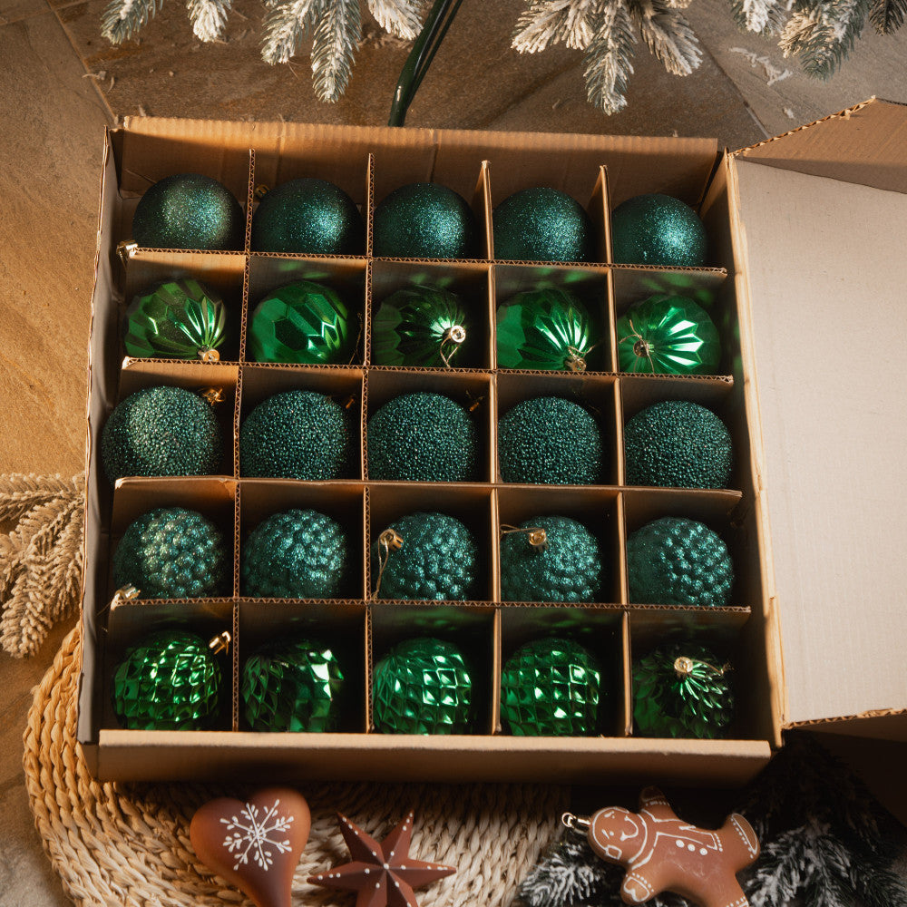 Цей набір святкових ялинкових кульок включає 25 витончених прикрас у стриманих відтінках смарагдового та зеленого кольорів. Кульки мають різноманітні текстури та дизайни: блискучі, матові, дзеркальні та з рельєфною поверхнею, що додає глибини й елегантності вашій новорічній ялинці. Виготовлені з якісного пластику, вони є легкими та безпечними для використання як у домі, так і на відкритому повітрі. Ідеально підходять для створення сучасного та стильного святкового декору. Кожна кулька має міцну петлю для підвішування. Поставляються у зручній упаковці для зберігання.