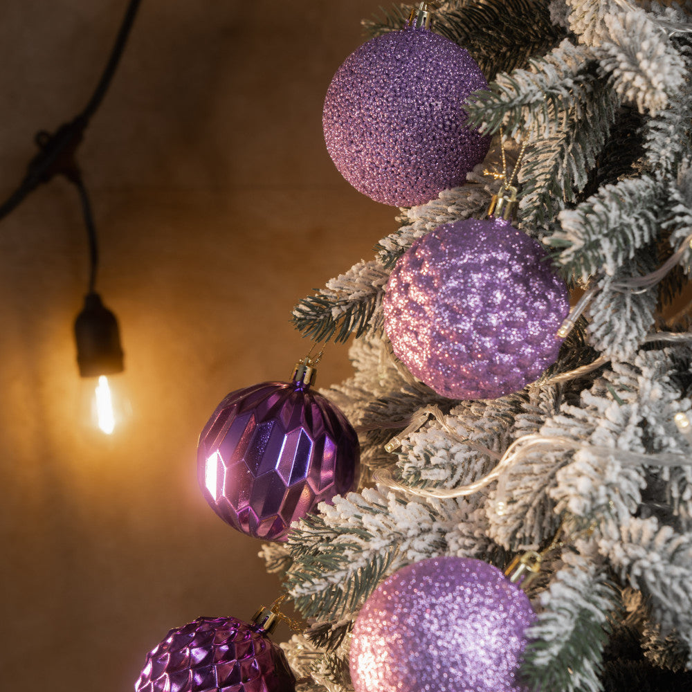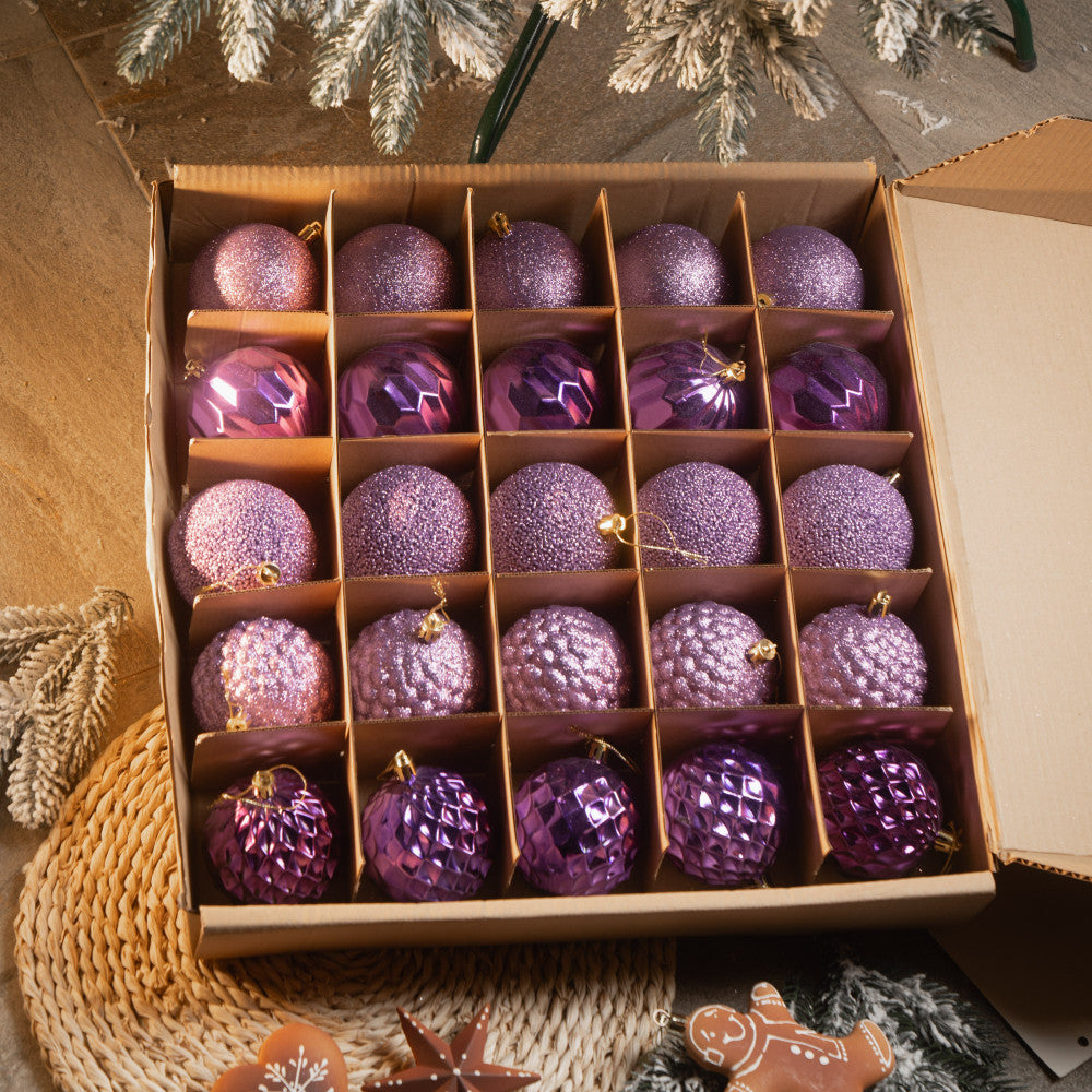 Цей набір святкових ялинкових кульок включає 25 витончених прикрас у стриманих відтінках фіолетового та лілового кольорів. Кульки мають різноманітні текстури та дизайни: блискучі, матові, дзеркальні та з рельєфною поверхнею, що додає глибини й елегантності вашій новорічній ялинці. Виготовлені з якісного пластику, вони є легкими та безпечними для використання як у домі, так і на відкритому повітрі. Ідеально підходять для створення сучасного та стильного святкового декору. Кожна кулька має міцну петлю для підвішування. Поставляються у зручній упаковці для зберігання.